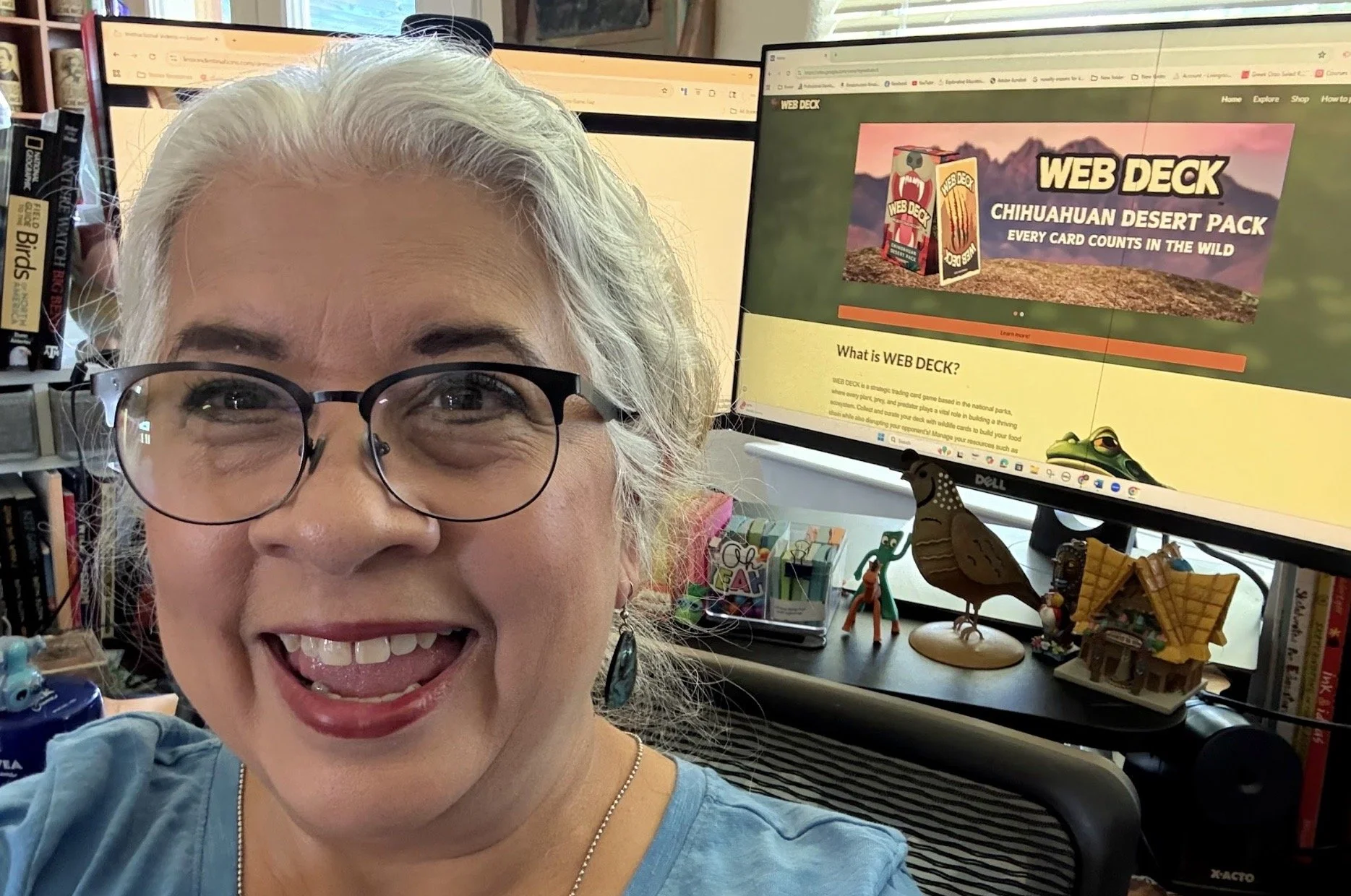 She has written lessons for the Texas Education Agency, El Paso ISD, Anthony ISD, and the TecH₂O Center. Right now, she’s channeling her creativity into WEB DECK Wildlife Trading Cards, an interactive card game that helps people of all ages discover the food webs and food chains found in our National Parks.